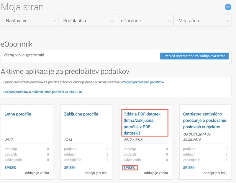 - "Moje strani" (s klikom na svoje uporabniško ime desno zgoraj) in izbiri "Oddaja PDF datotek (letna/zaključna poročila v PDF datoteki)" ali "Spisek"