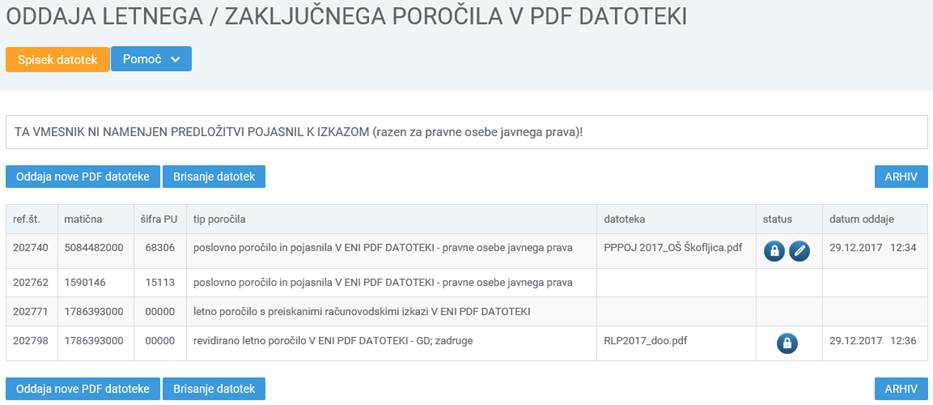S klikom na gumb "ARHIV" lahko pregledujete poročila v PDF datoteki, ki ste jih z istim uporabniškim imenom oddali v preteklih letih in imate pravice v sistemu Pooblastil. V seznam PDF datotek za zadnje leto se vrnete s klikom na gumb "SPISEK AKTIVNIH".