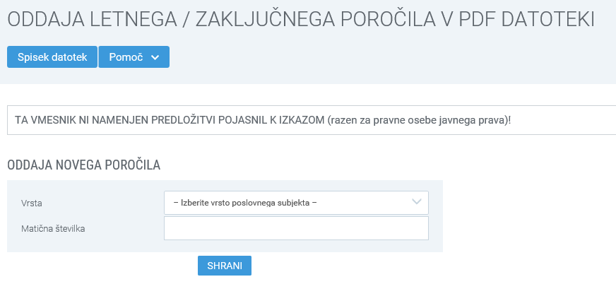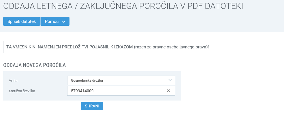 Po vstopu v aplikacijo dobite seznam že oddanih poročil, za katera imate pravice v sistemu Pooblastil. S klikom na izbrano matično številko nadaljujete postopek oddaje letnega poročila, novo datoteko pa dodate s klikom na gumb "Oddaja nove PDF datoteke".