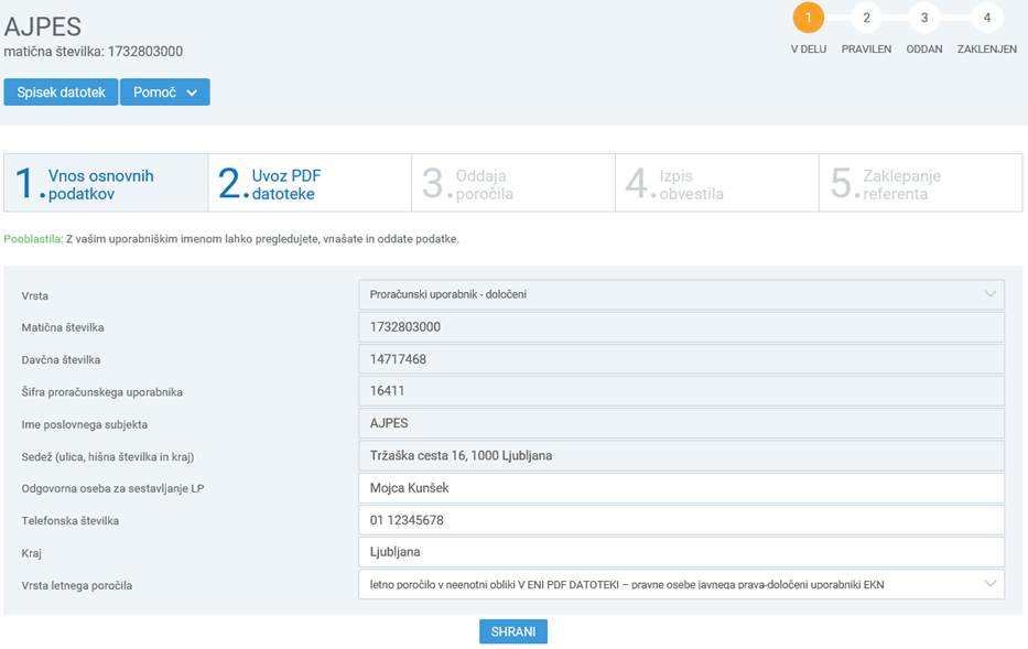 Podatke shranite s klikom na gumb »SHRANI« ali tipko Enter, ki vam odpre 2. korak. Uporabnik se vrne na prejšnji korak tako, da klikne aktivno povezavo z imenom koraka.
