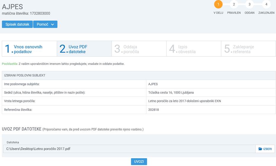Za uvoz PDF datoteke kliknete gumb »IZBERI«, poiščete PDF datoteko na svojem računalniku in datoteko označite. Po kliku na gumb »Odpri« se v polje ob gumbu »IZBERI« vpišeta pot do datoteke in ime datoteke. Z izbiro gumba »UVOZI« program datoteko uvozi in vam odpre 3. korak. Uporabnik se vrne na prejšnji korak tako, da klikne aktivno povezavo z imenom koraka.