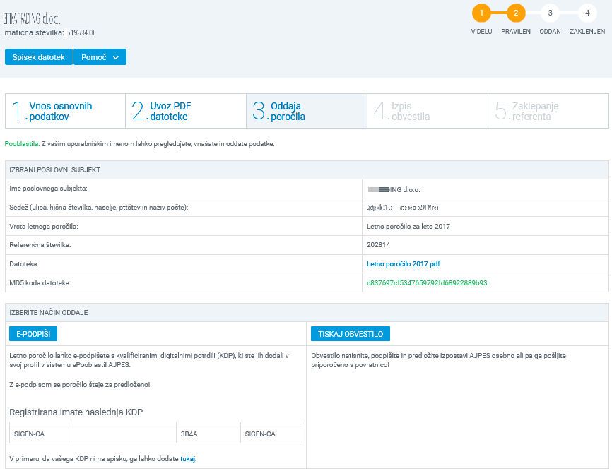 Preverite vsebino predložene PDF datoteke ter izberite način oddaje. Izjema so pravne osebe javnega prava (POJP), ki letno poročilo oddajo samo s kvalificiranim digitalnim potrdilom (KDP)